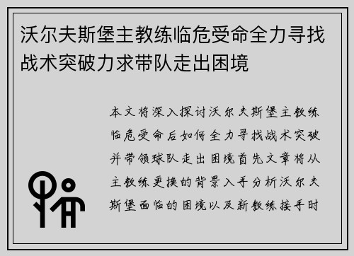 本文将深入探讨沃尔夫斯堡主教练临危受命后,如何全力寻找战术突破并带领球队走出困境。首先,文章将从主教练更换的背景入手,分析沃尔夫斯堡面临的困境以及新教练接手时所面临的挑战。接着,文章会探讨主教练如何通过调整战术体系、改变阵型、激发球员潜力以及加强心理建设等多方面的措施来力求带队突破困境。通过详细阐述这些战术调整和策略,最终主教练带领沃尔夫斯堡逐步走出低谷,回归强队行列。最后,文章将对沃尔夫斯堡主教练临危受命的经历做出总结,强调在压力中求变、调整中的重要性。